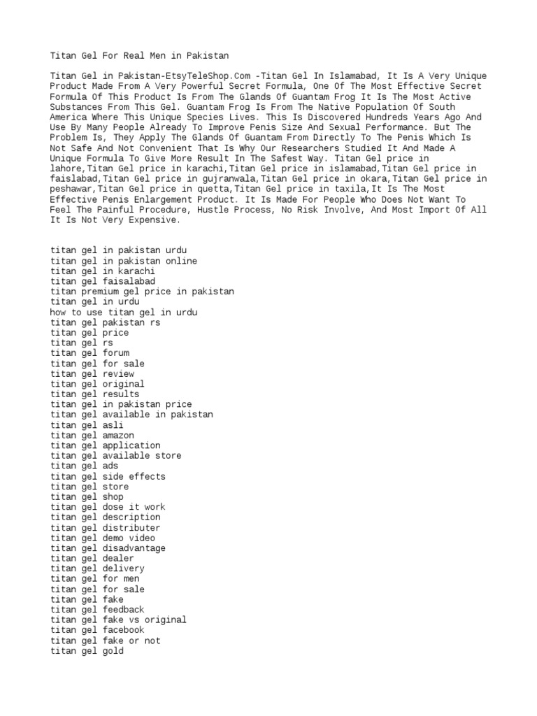 The titan gel price in pakistan contains special ferments. The gel ought to be applied with massaging movements on an erect erectile organ. Interview of titan gel user from pakistanhave a joke time ️ Titan gel can increase sexual endurance. Its formula works to encourage the expansion and growth of tissues, it is easily absorbed by the body and must be applied over the entire length and girth of the male organ, massaging with the fingertips from the root to the glans. It is a male enlargement gel. Titan gel manual tagalog manual titan gel gold titan gel red titan gel original dahil sa inyong pag tangkilik, minabuti naming gumawa ng espesyal na manual na inilaan naming para lamang sa inyo. Men are advocated to rub titan gel on their palms and apply it on penis. How to use titan gel? Let the gel remain in place for a minimum of 10 minutes. Titan gel in pakistan call 03015110055 free home delivery anywhere in pakistan call/whats app for ordering at 03015110055 titan gel, titan gel price, titan gel result, how to use titan gel, original titan gel, titan gel in pakistan, titan gel in karachi, titan gel in lahore, titan gel in islamabad, titan gel in peshawar, titan gel in quetta, titan gel use in urdu, titan gel benefit in urdu. Titan gel use in urdu titan gel particular gel for males. The manufacturer claims that the product helps men perform great in bed.